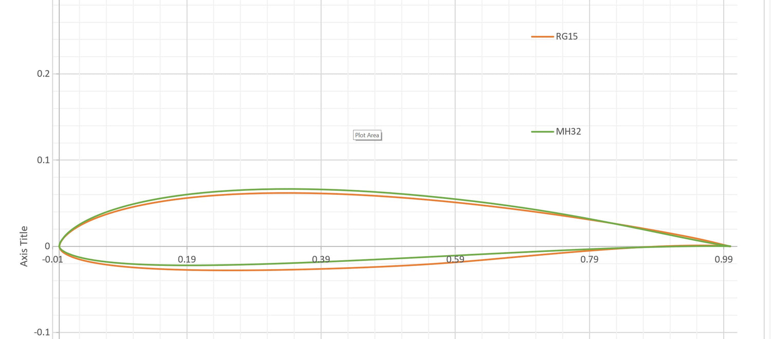 This airfoil was also designed for competition and in the 1990s did very well in F3B. It is a similar section to the RG15, with similar lift to drag, but has more camber. This added camber changes the lift curve and smooths out the stall drop off, lift is stronger at lower angles and the moment is greater (more stable) giving this airfoil more forgiving qualities. However the MH32 is not as fast as the RG15, but still has a wide speed range and wing loading capabilities.