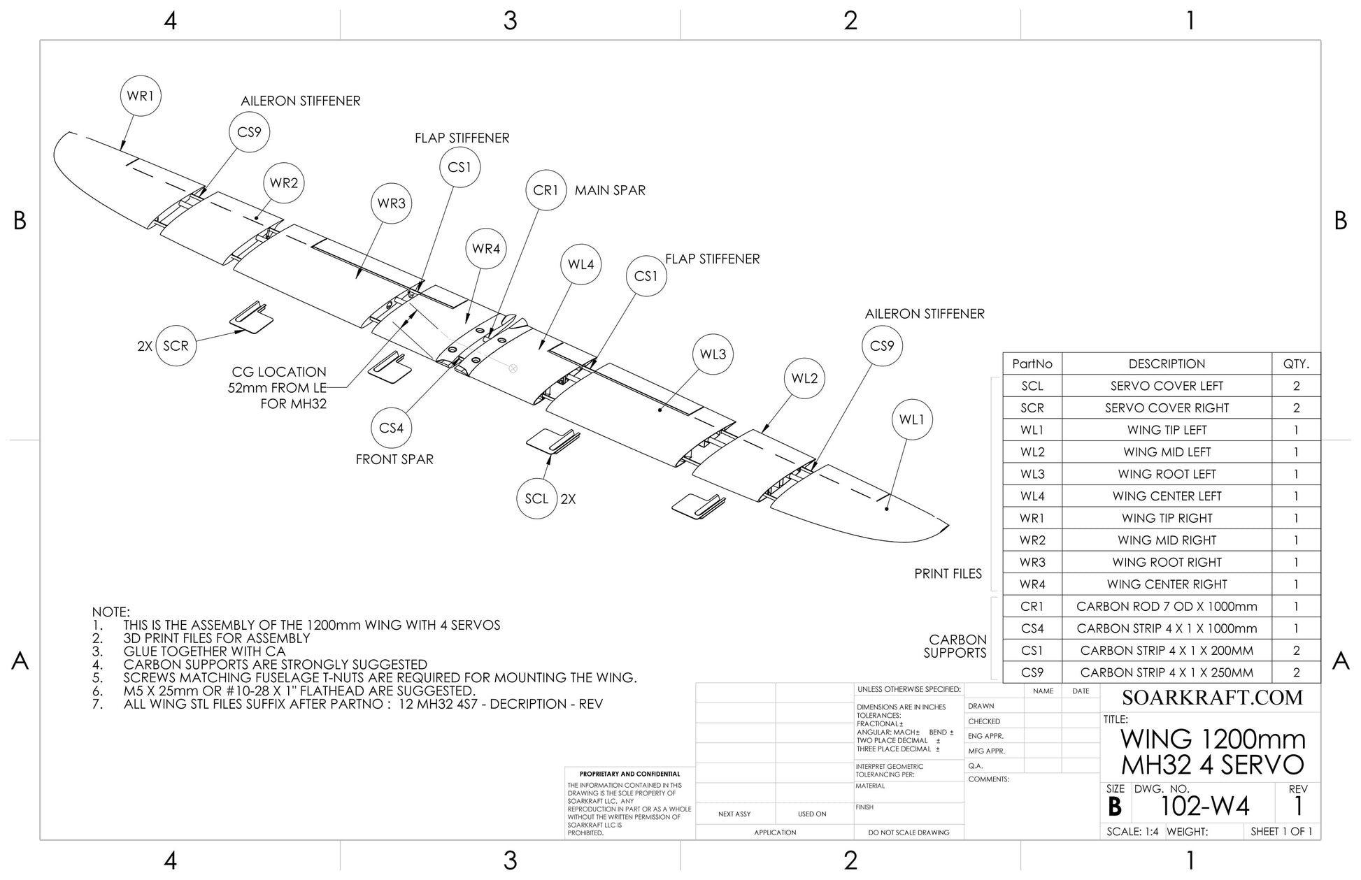 Recommended wing - The MH32 4 Servo - this wing was designed to match well with the power system, with a higher lift curve for faster climbs and longer thermalling. With a hotter motor this wing can still show great speed and does well on the slope... a good all around wing. This wing design also uses a 7mm spar tube (instead of 6mm) offering the same stiffness as a solid 6mm spar, but almost haft the weight. This pared with the Polymaker LW-PLA makes for a light weight but stiff wing for long flights and amazing performance.
