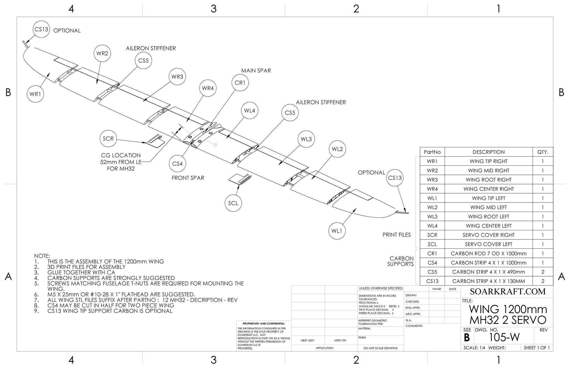 These are the STL print files for the 1200mm SoarKraft wing with the MH32 Airfoil. This wing uses the additional carbon reinforcement and can be printed out of a variety of materials.