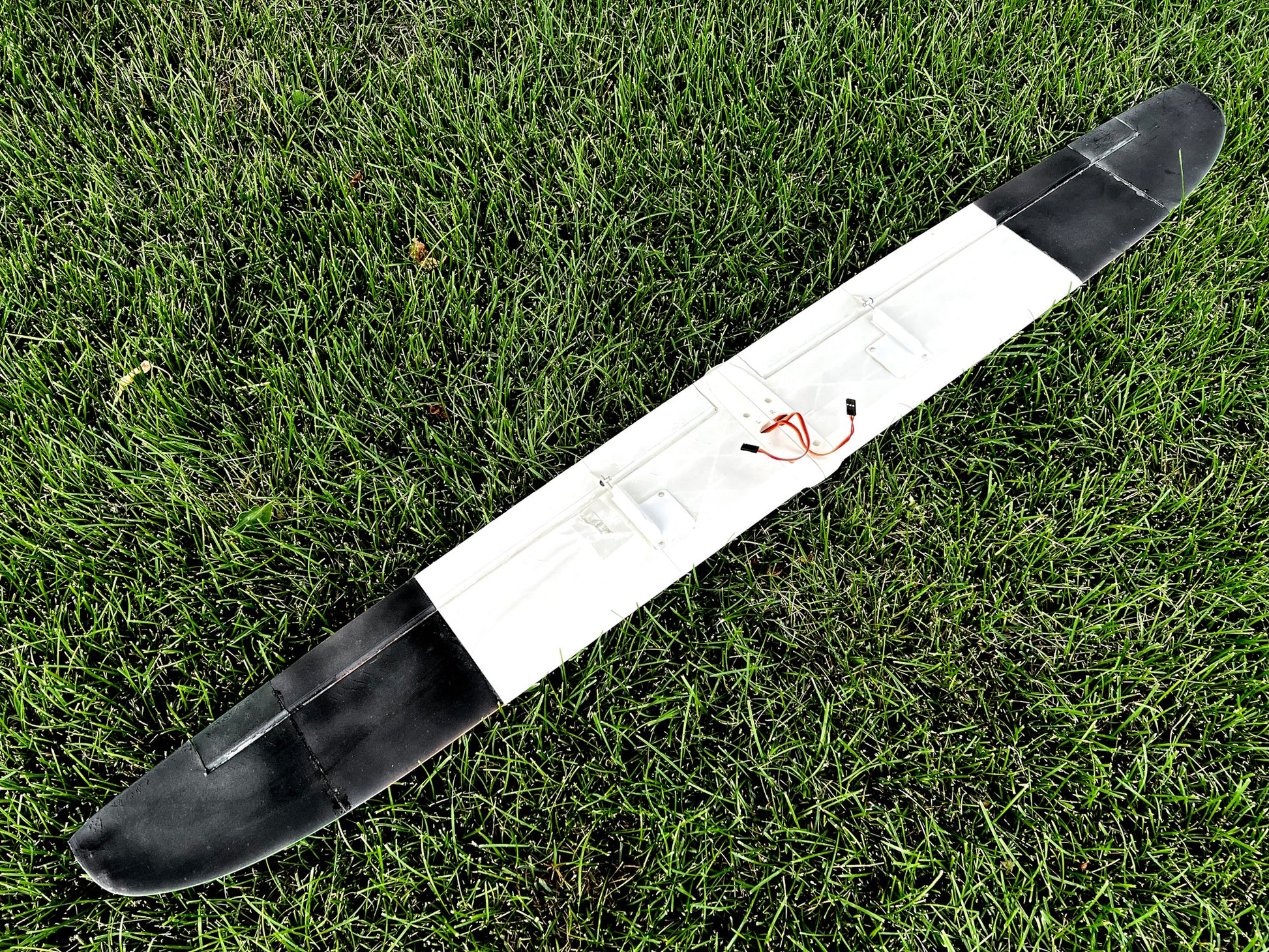 This wing uses only 2 servos to control full span Ailerons: right and left. These can be programmed for more complex use such as flaps, reflex, camber (climb) and snap flaps. Easier to set up and build than the 4 servo wing and can use a less complex receiver as well. Ailerons are 490mm each.